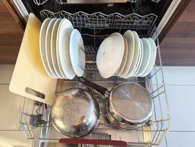 Put a dishwasher tablet in the tray and slide the tablet door shut. Dishwasher tablets are in the cupboard under the sink between the dishwasher and sink (bottom left).